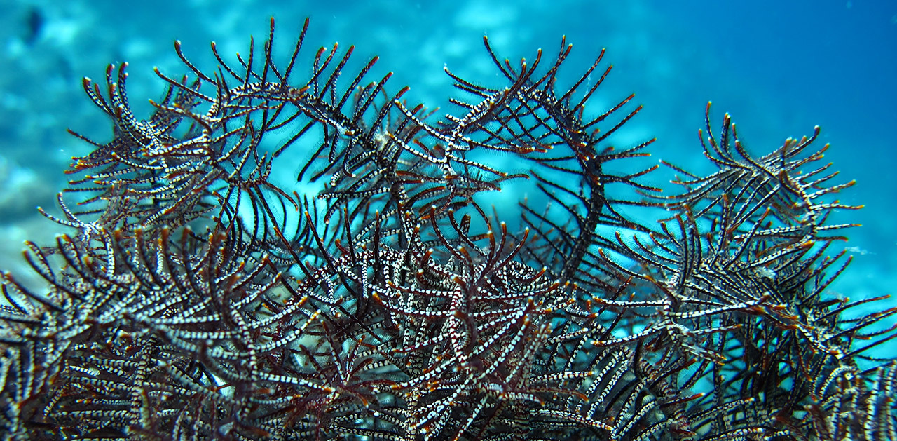 Despite their plant-like appearance, crinoids are animals, related to sea stars and sea urchins.