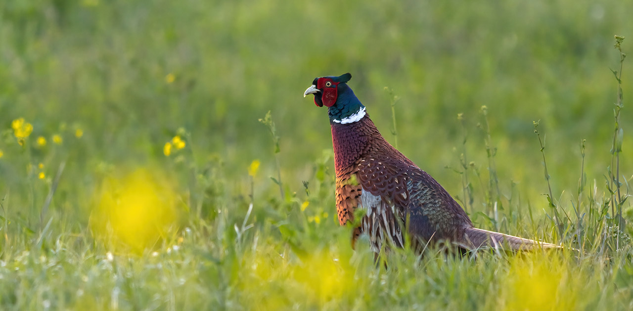 The Common Pheasant is a bird of extraordinary beauty and complexity. Males are particularly striking, with their iridescent copper and gold plumage, red face, and long, tapering tail.