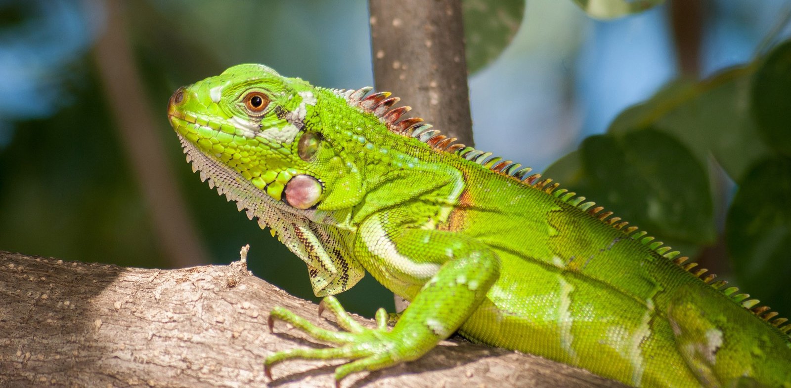 Iguanas are large lizards belonging to the family iguanidae and characterized by a robust elongated body, spiky scales on their backs, and a flap of skin underneath their head called a dewlap. They are native to North and South America and got their name from the Tiano word “iwana“.